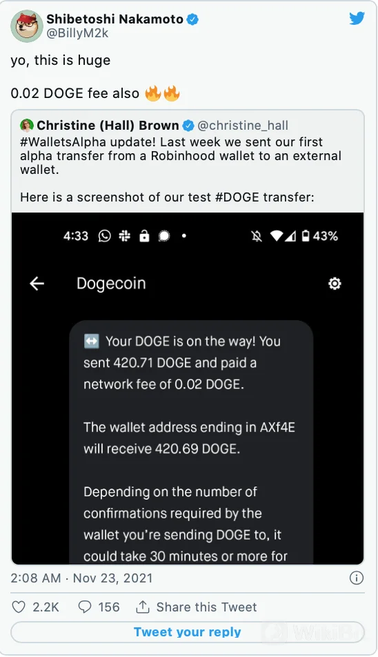 Christine Brown, Chief Operating Officer di Robinhood Crypto, meluncurkan tangkapan layar melalui tweet di mana dia menunjukkan transfer DOGE yang terjadi minggu lalu.