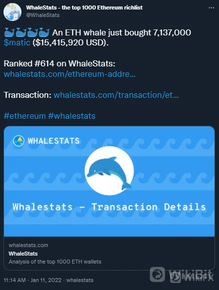 WhaleStats melaporkan empat transaksi MATIC besar oleh para Whale. Pembelian terbaru adalah paus Ethereum yang memperoleh 1.149.996 MATIC, atau senilai $ 2.495.491. Paus ETH lainnya dengan peringkat 614 di WhaleStats memperoleh 7.137.000 MATIC, atau senilai $15.415.920.